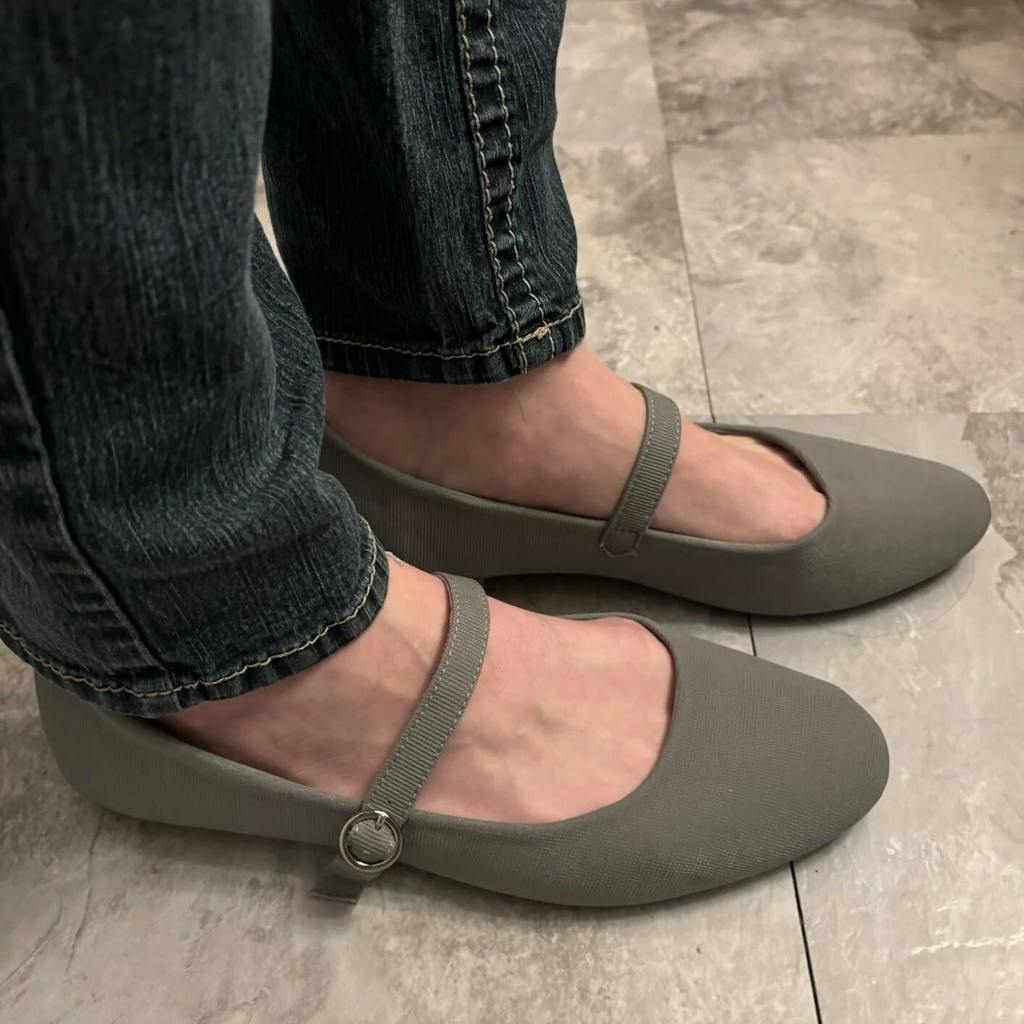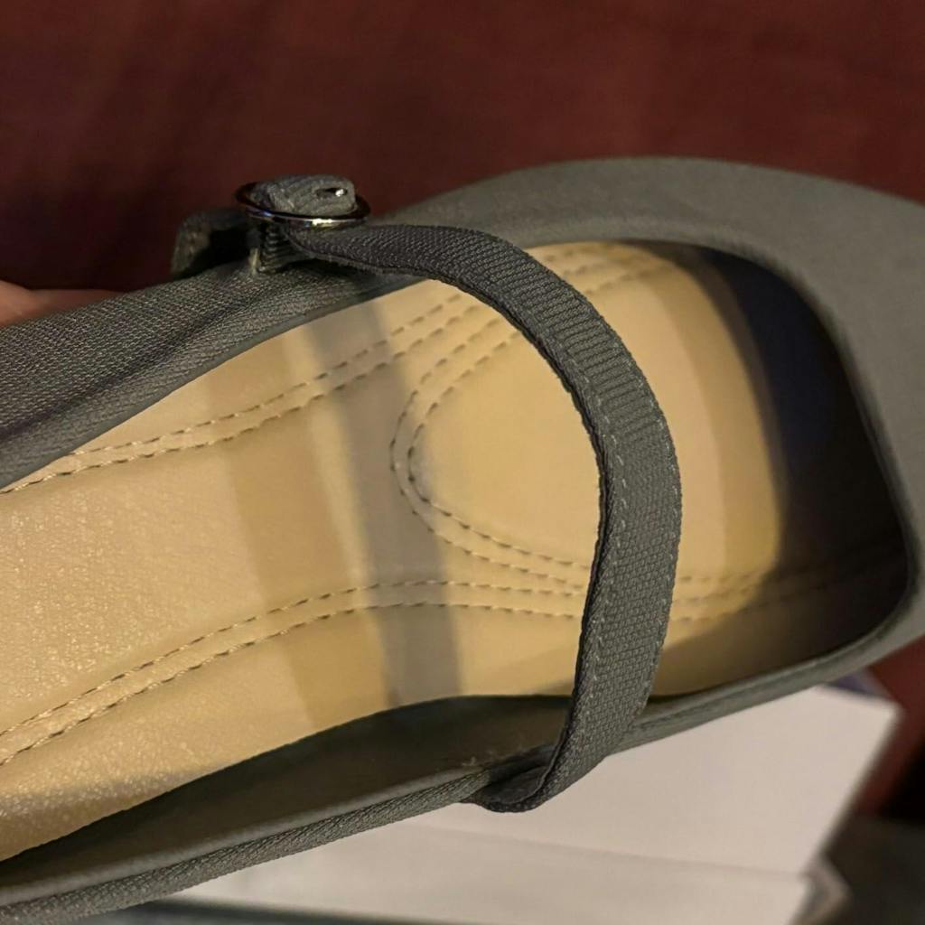 These flats run true to size and are comfortable to wear. They feature a padded footbed, low/nearly flat heel, and adjustable cross strap (there are 3 holes on the strap for the buckle). There was a tiny spot on the front side of one of the shoes, but it isn’t too noticeable.