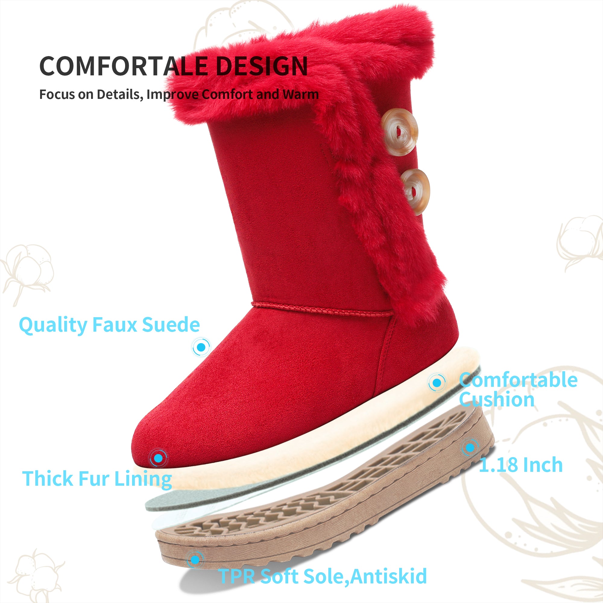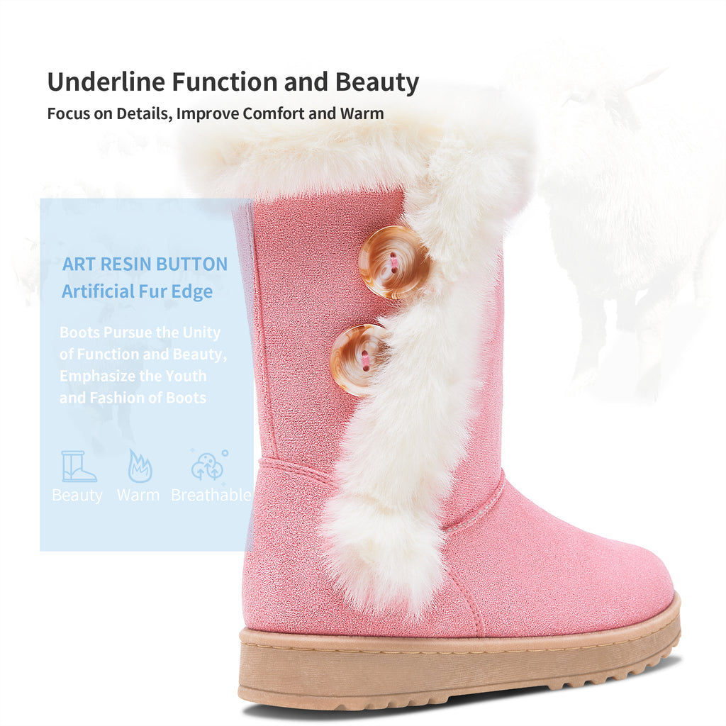 • BEAUTIFULLY DESIGN:Black snow boots for women underline positive feelings,Beautifully design,requires Fashion and function.Art resin button,Artificial Fur Edge,Mid Calf winter snow boots reflect women's desire for fashion, youth and beauty.